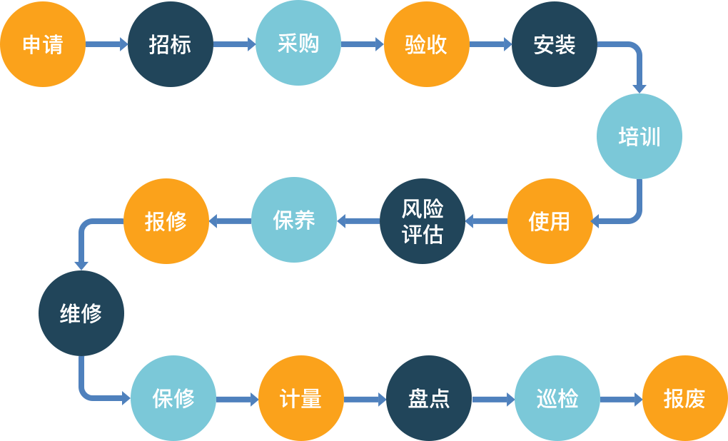 實現(xiàn)設(shè)備的驗收入庫、出庫、在用、盤點、巡檢、調(diào)動、維修、報修、折舊、注銷等全流程管理;