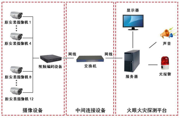 城市地下綜合管廊中應(yīng)將電力、通信、廣播電視、供熱、燃?xì)?、給排水等城市管線集中設(shè)置在一條管廊內(nèi),由于其中的電力、通信、廣播電視、燃?xì)獾裙艿谰谢馂?zāi)危險(xiǎn)性,而管廊內(nèi)平時(shí)除檢修外無人值守,但管廊內(nèi)一般都設(shè)有視頻監(jiān)控系統(tǒng),為了及時(shí)探測管廊內(nèi)可能出現(xiàn)的火災(zāi),做到早發(fā)現(xiàn)、早報(bào)警、早處理、利用管廊內(nèi)原有的視頻監(jiān)控系統(tǒng)安裝“火眼”軟件是比較合適的。