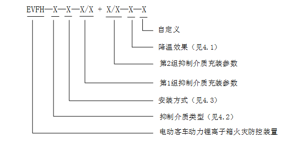 示例:EVFH-Q-W-4/4.2+5/5.7-J表示充裝氣體類抑制介質(zhì),安裝于電池箱外部,第1組抑制介質(zhì)質(zhì)量4kg,貯存壓力4.2MPa;第2組抑制介質(zhì)質(zhì)量5kg,貯存壓力5.7MPa,降溫型電動客車動力鋰離子電池箱火災防控裝置。
