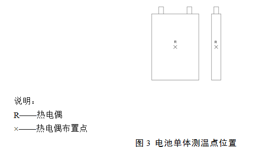 將電池按圖1所示布置于電池箱內(nèi)部,并在圖1所示的電池單體處安裝加熱設(shè)備,并使加熱設(shè)備與電池緊密接觸。按制造商設(shè)計設(shè)置危險源探測部件、聲光報警裝置與火災防控裝置其他部件,并在試驗電池周圍布置多個測溫裝置(如圖1、圖3所示)。關(guān)閉電池箱頂蓋,啟動加熱裝置對電池加熱,觀察危險源探測部件、聲光報警裝置及火災防控裝置在滿足7.2.3時的警示情況、自動、手動啟動情況、火災抑制介質(zhì)噴放情況。同時記錄各測溫裝置的數(shù)據(jù)。
